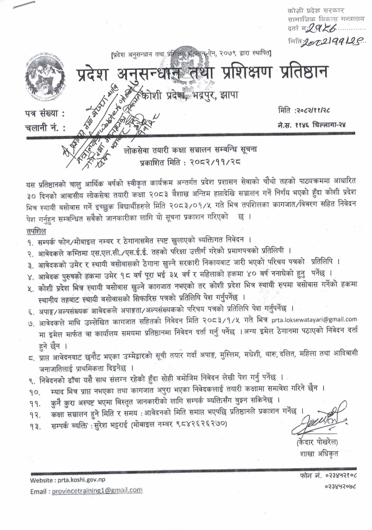 लोक सेबा तयारी कक्षा सञ्चाल सम्बन्धमा